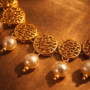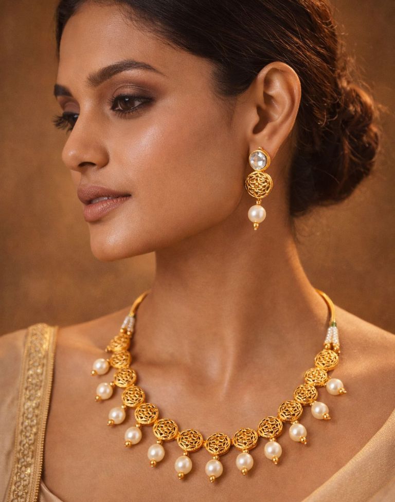 Beautiful gold-toned necklace set featuring intricate round motifs with pearl drop detailing, perfect for a royal ethnic look.