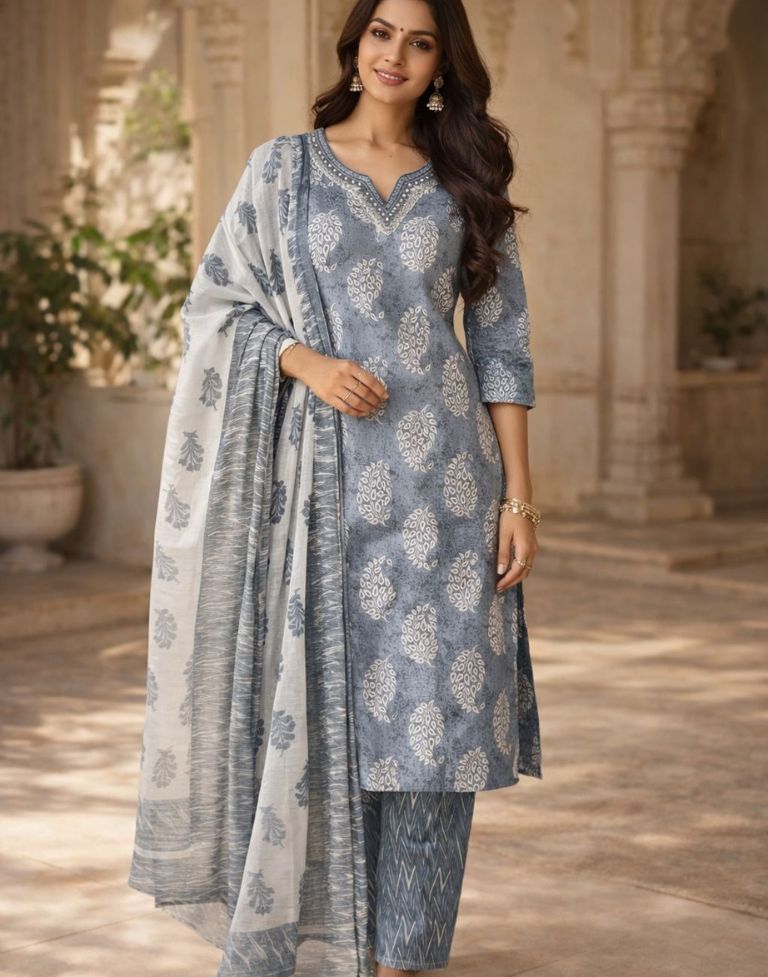 Elegant Grey & White Color Palette – Soft, soothing tones with traditional ethnic prints for a refined look